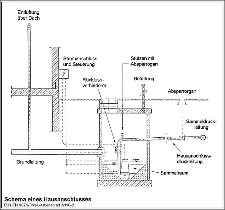 Hauspumpstation mit Grundstücksanschluss, öffentliche Entsorgungsleitung als Druck- oder Freigefälleleitung, Spüleinrichtung, ggf. Hauptpumpwerk und Ableitung zur Kläranlage.