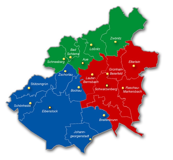 - Eibenstock (mit OT Wildenthal, Blauenthal, Carlsfeld, Wolfsgrün, Neidhardtsthal und Sosa)